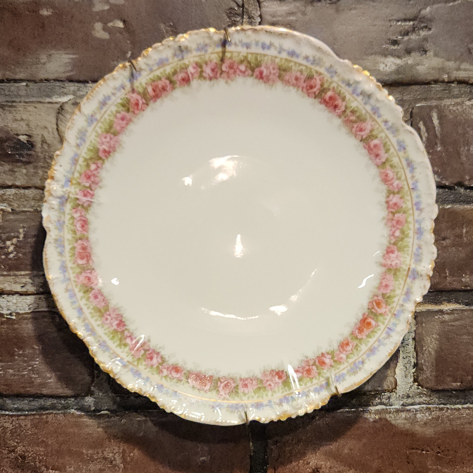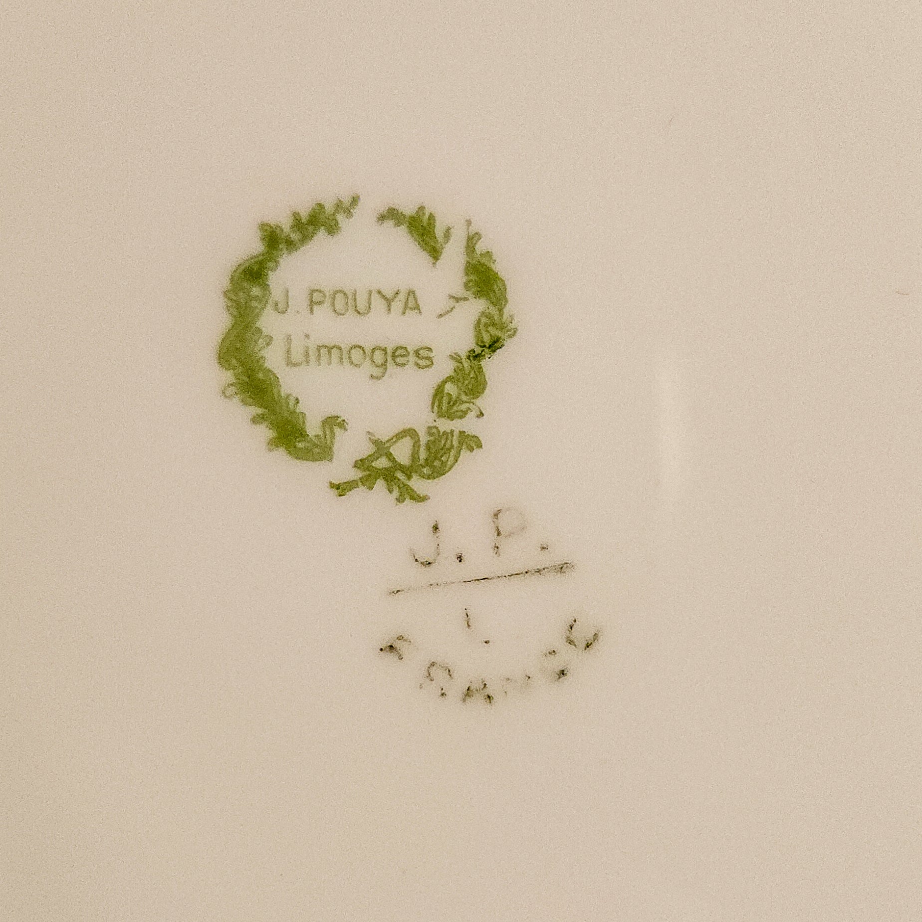 French porcelain dinner plate from J. Pouya Limoges. Floral design on white plate with gilded decorative edge. Pink roses, periwinle flowers, greenery and gold trim.