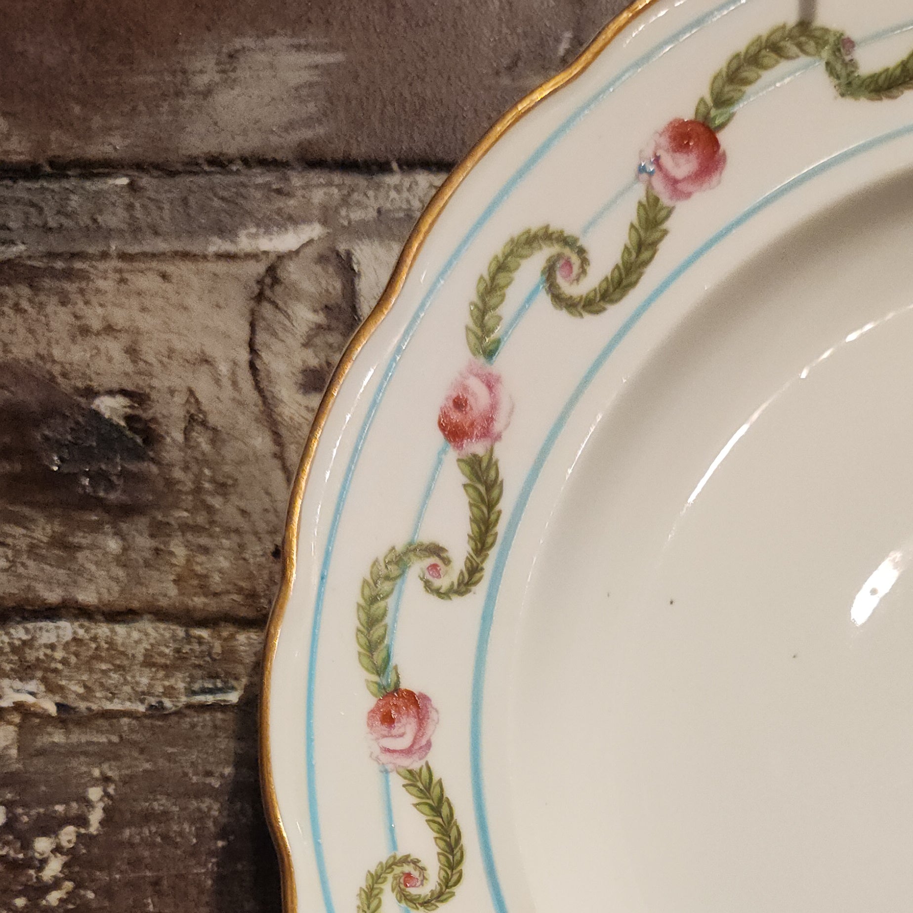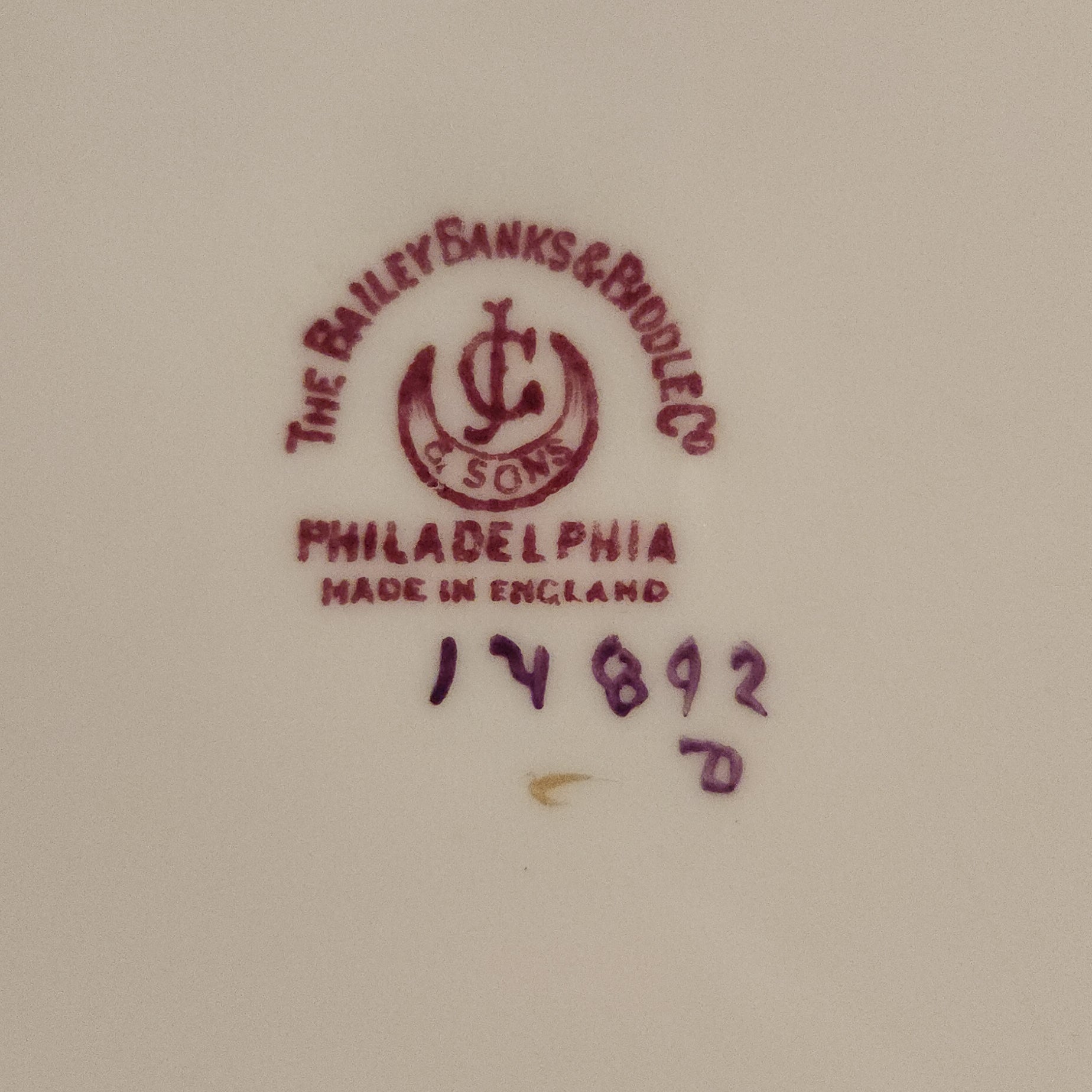 Porcelain plate from The Bailey Banks & Paddle Co. Philadelphia. Made in England. Floral design on white plate with gilded and scalloped edge. Pink roses, leaves and gold decoration.