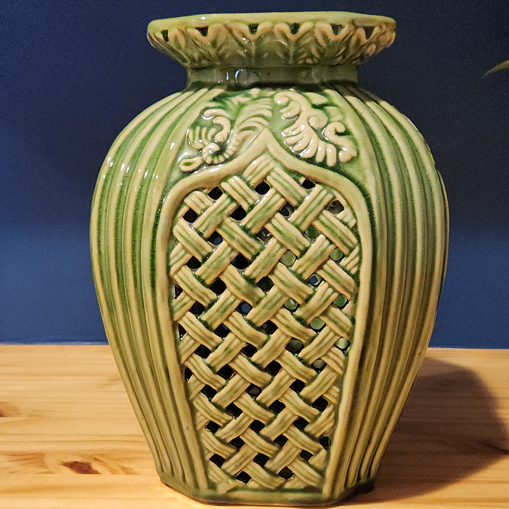 Reticulated basket weave and striped patterned vase with green glaze. Ceramic pottery with no maker's mark. Jar is glazed outside and inside.