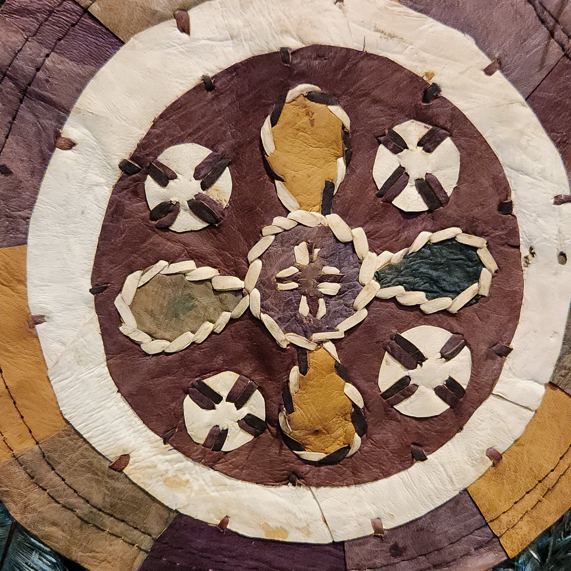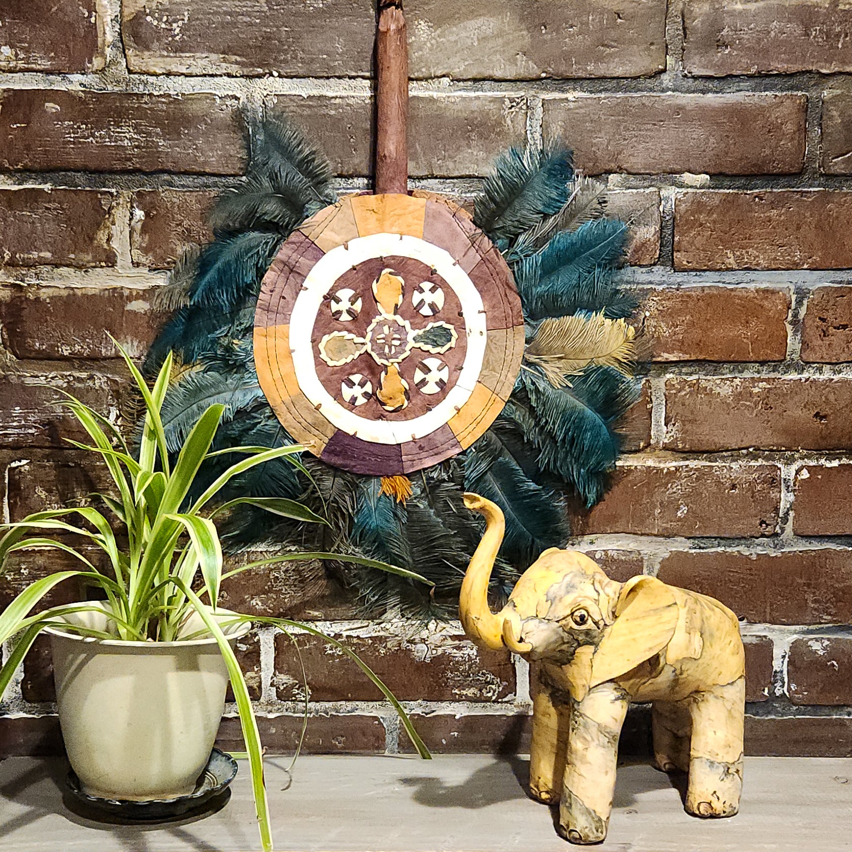 Ceremonial tribal fan made with ostrich feathers and leather. Approximate 16" diameter. The handle is made from wood and is covered in brown leather and has a loop at the end, so it can be hung with ease. It originates from Africa.