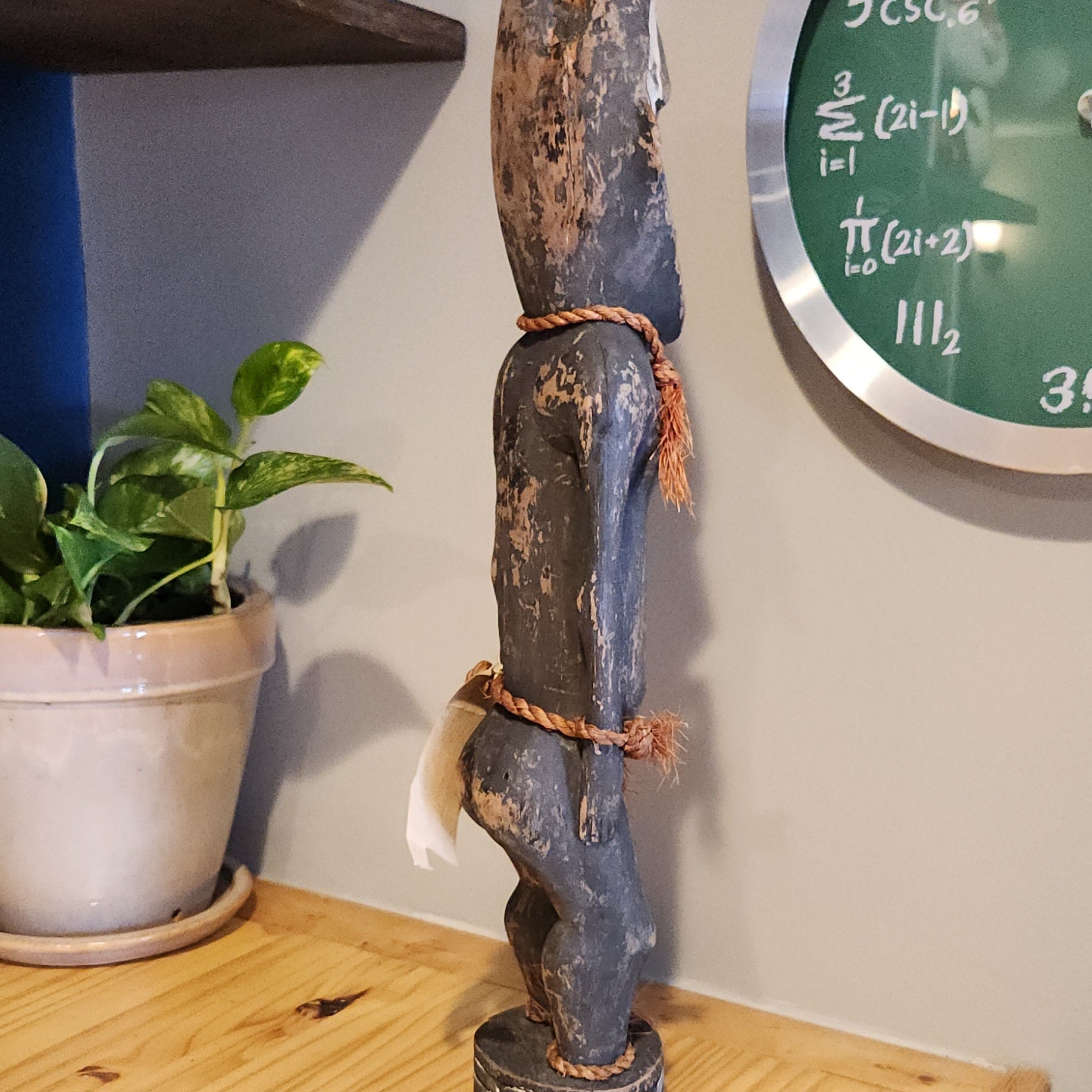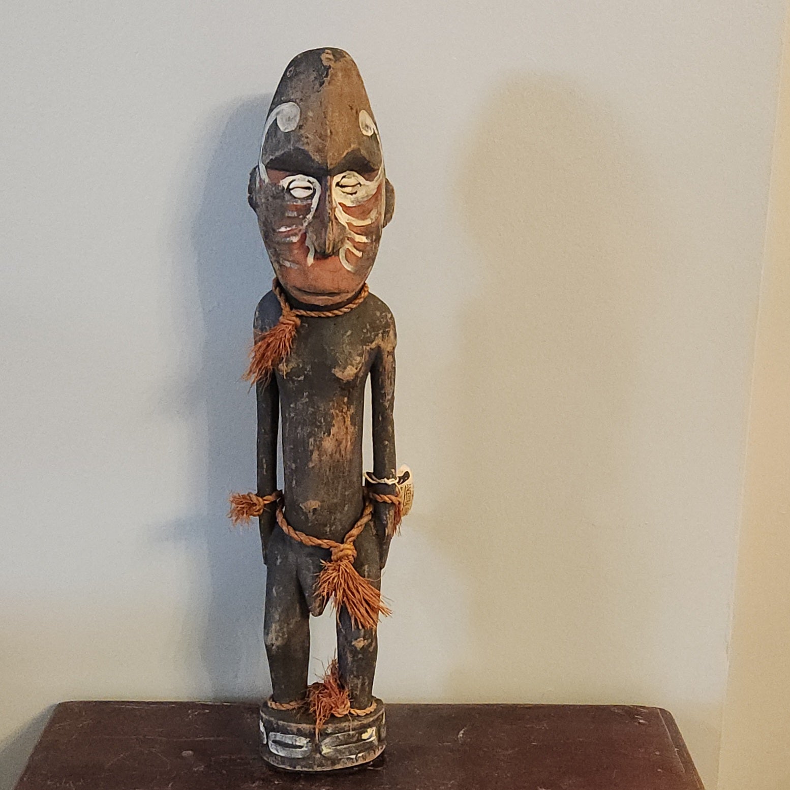 Wooden carved and painted figure. Papua New Guinea ancestral figure from the Sepik River Region. Shell eyes, rope details and original tag.