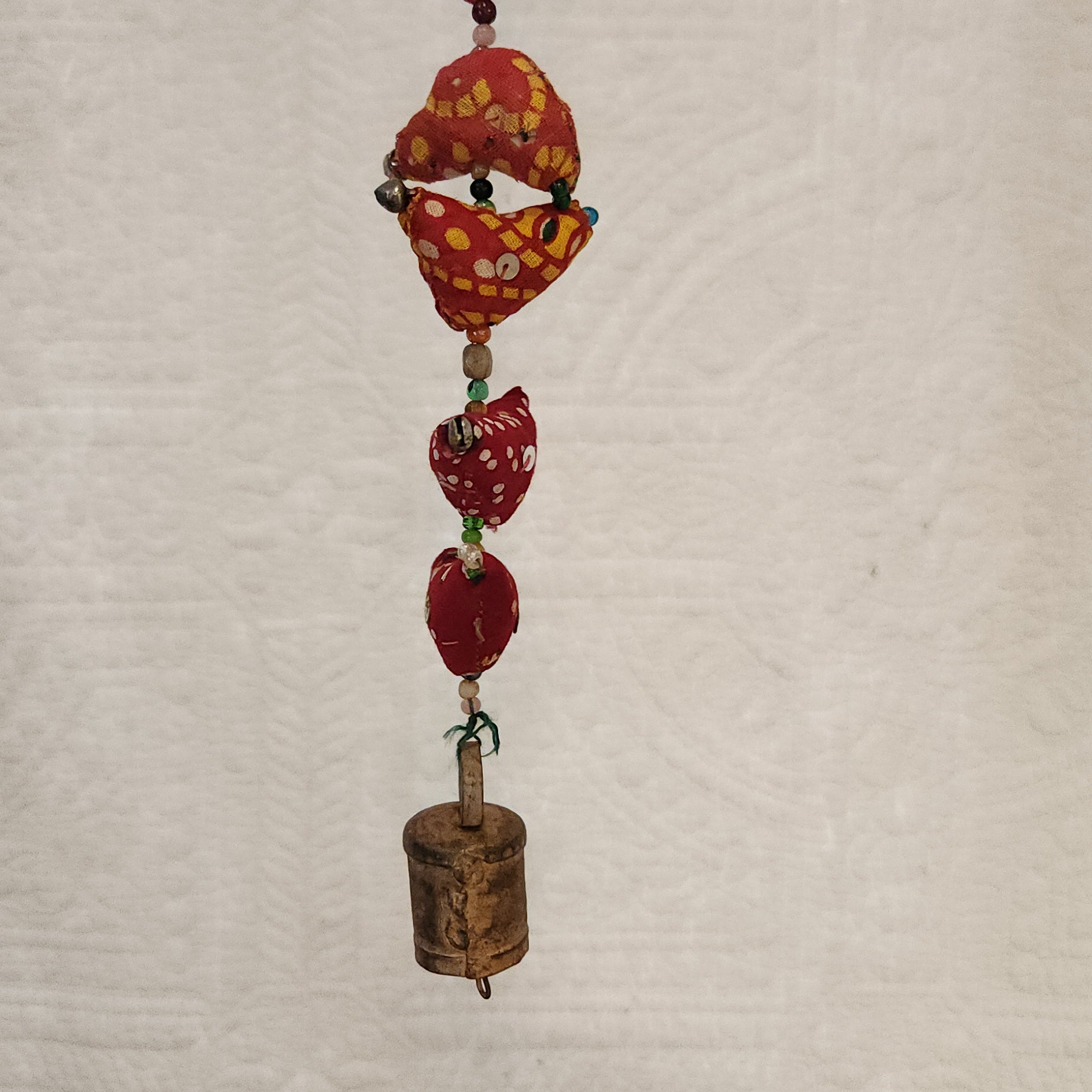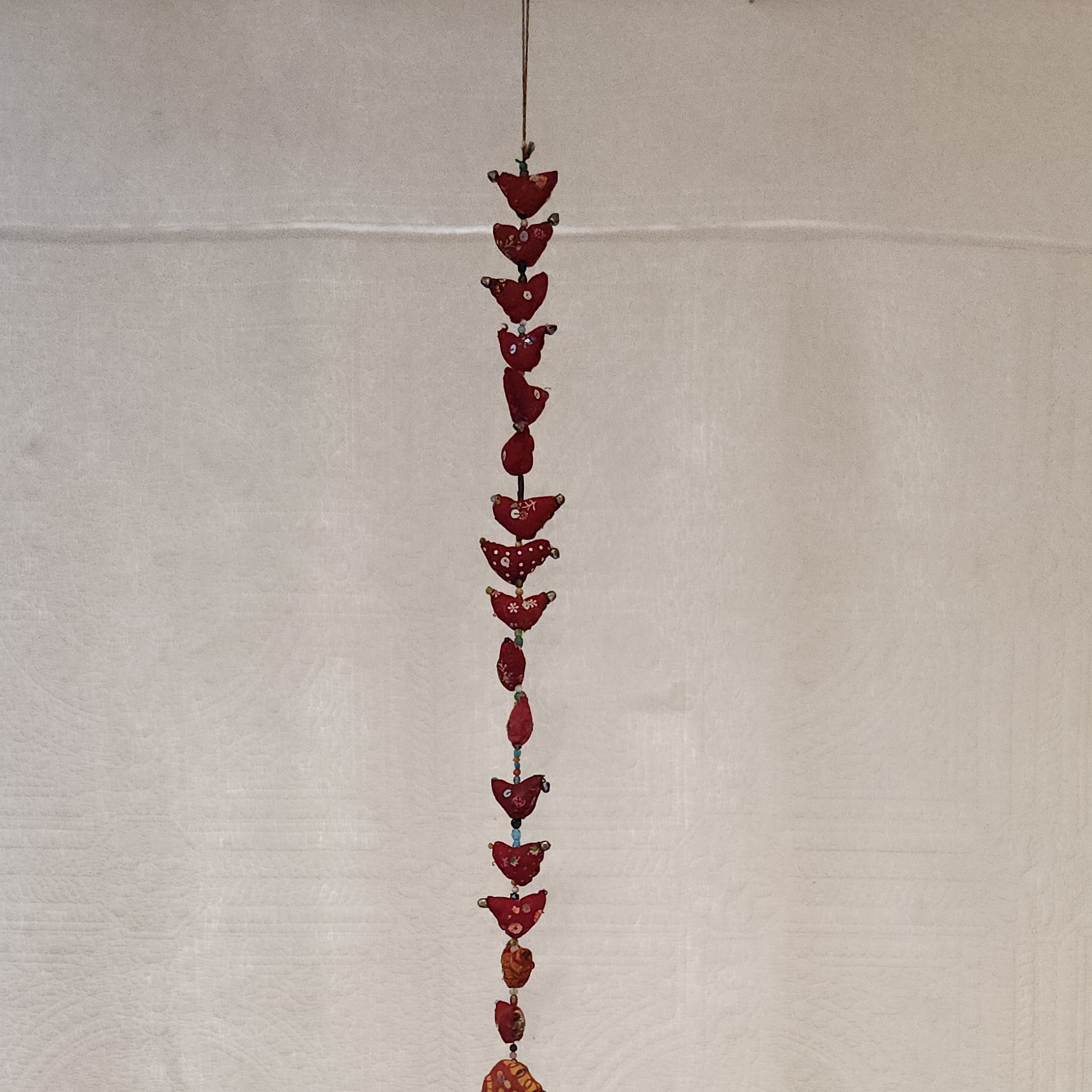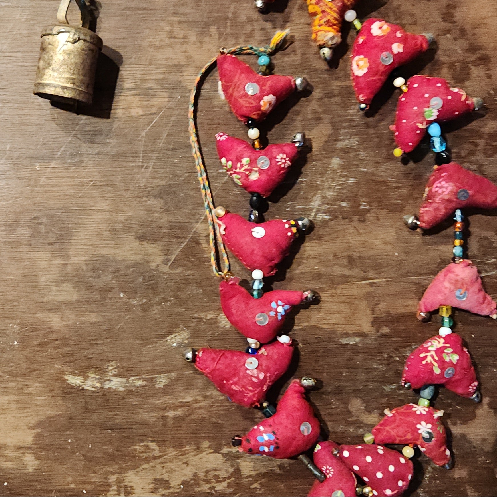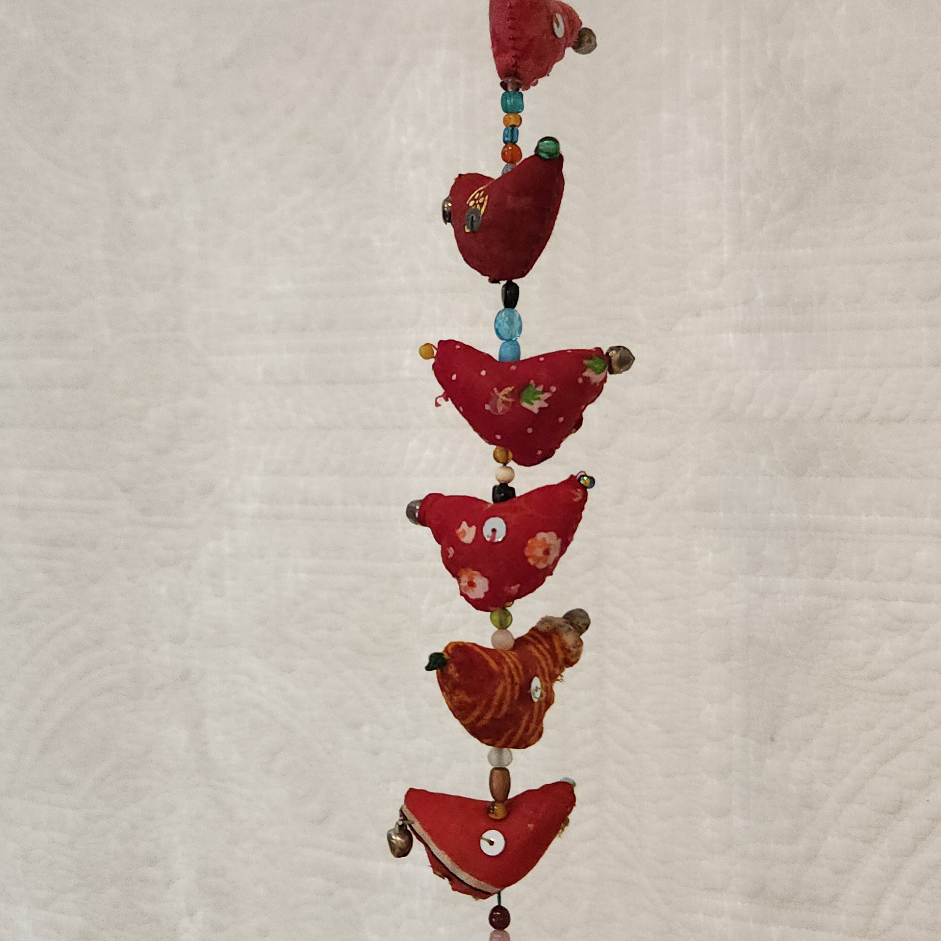 Patterned and floral red fabric hens strung with multicolored beads and decorated with gold/brass metal bells. Bells adorn the tails of many of the birds with a larger bell finishing off the end of the strand. Sewn sequins and beads add additional details. Strand with hanging loop measures 31". Without loop, 26.5"