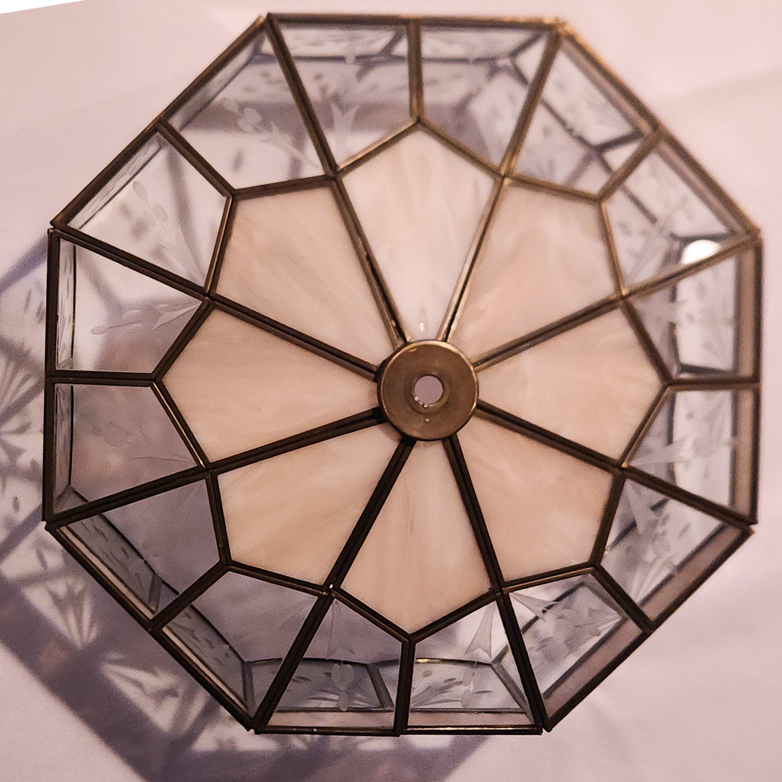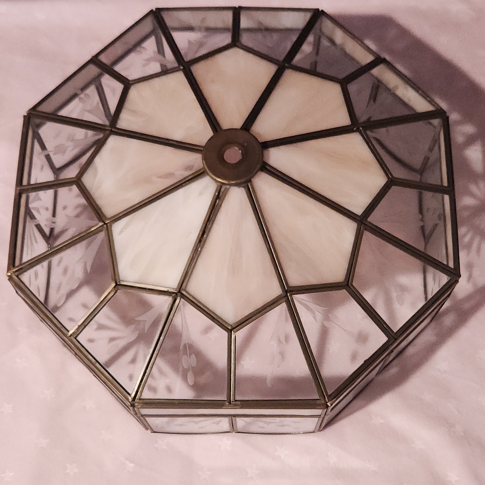 Slag glass light shade with light pink and clear glass with leaf etchings. Shade has scalloped edges and brass leading.