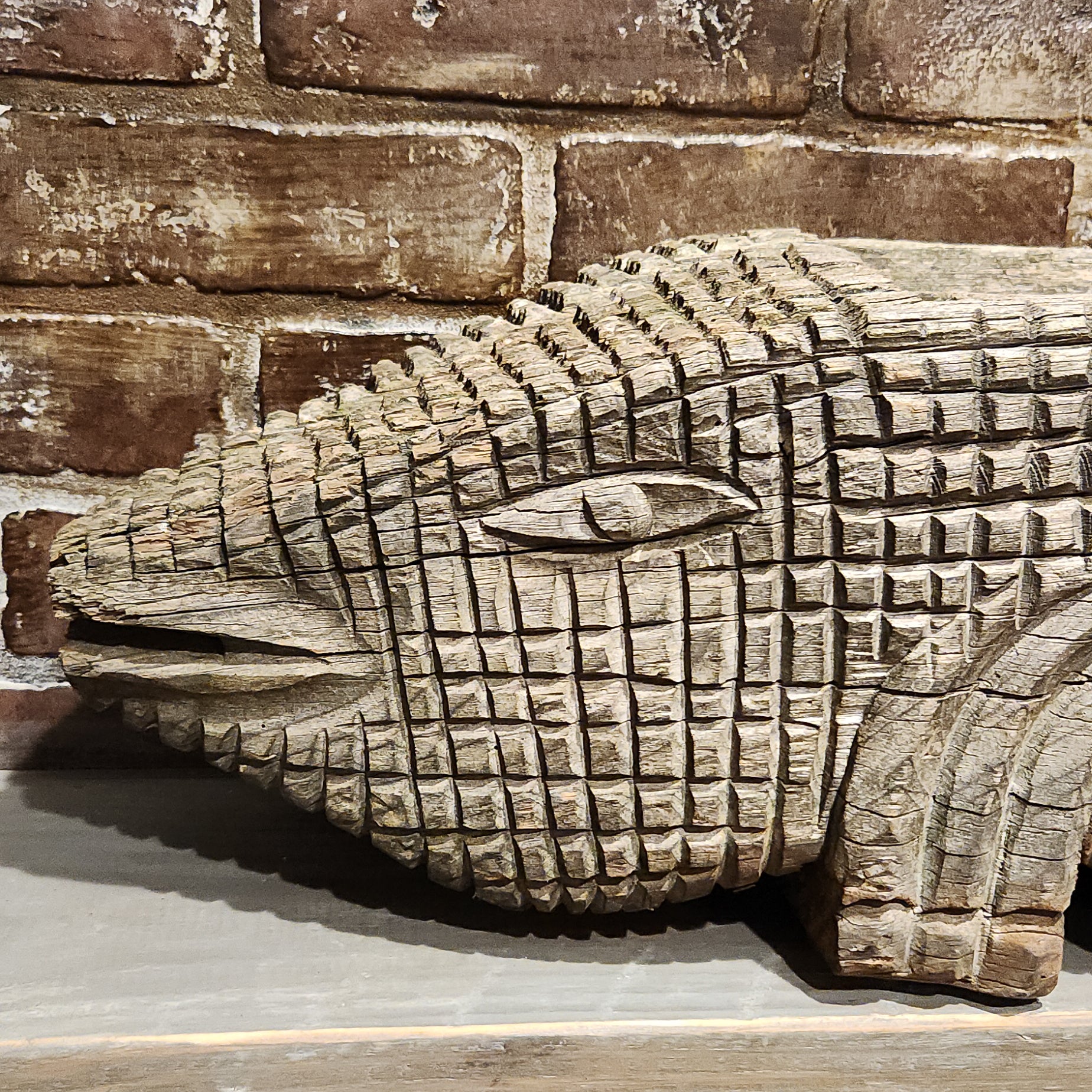 Large carved wooden lizard or alligator with opening in center. Can be used as a planter or other decorative holder.